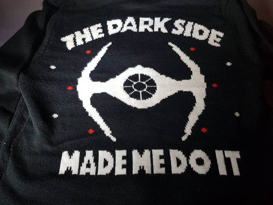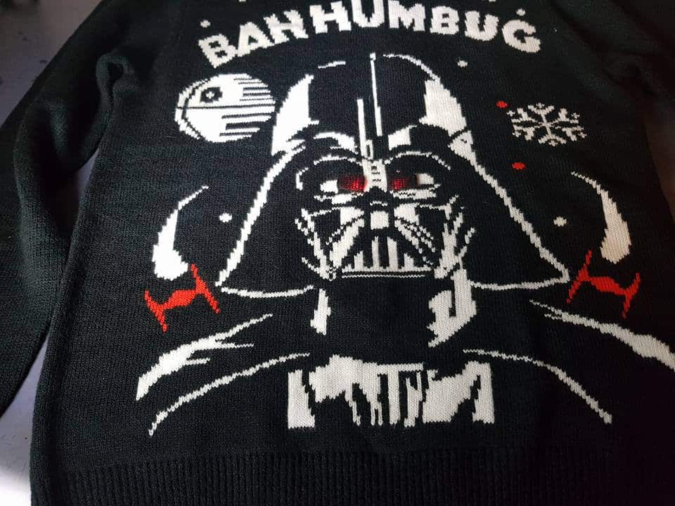 Everyone needs a new Christmas Jumper and what is better than a geeky jumper with lights and sounds. This Star Wars jumper from Tesco features light up eyes which work based on movement rather than pressing a button and add a real sinister feel to the Darth Vader face. It also features the imperial march song by pressing the button on his neck. My favourite touch has to be the back which features the phrase “The Dark Side Made Me Do It”.