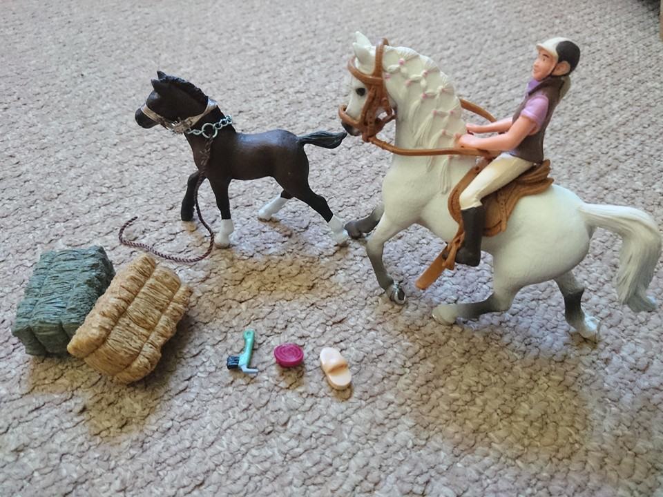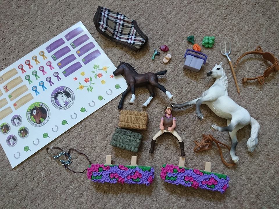 Retailing at just under £100 I expected a lot from this set and I have to say that I wasn’t disappointed. If you are unfamiliar with the Schleich products they are extremely high quality molded plastic that promotes imaginative play. The Schleich Horse Club Riding Centre comes with a rider, two horses, a feeding set, saddles and reins, a grooming set and bales of hay as well as the riding centre building.