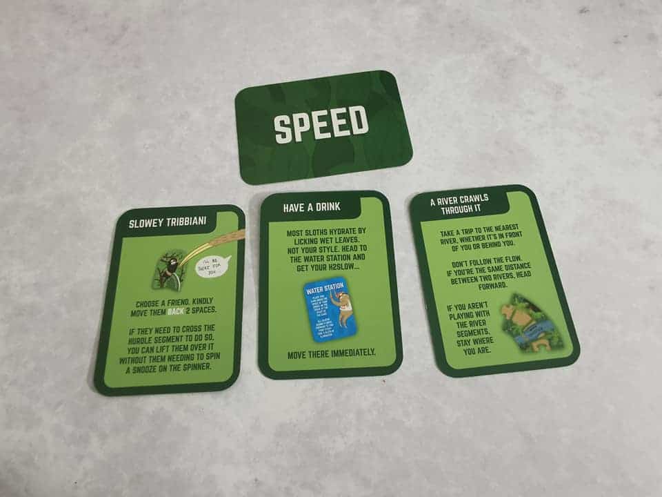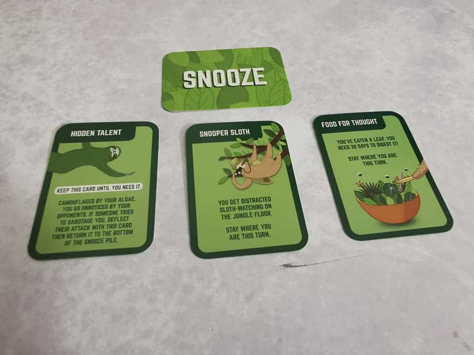 The Speed cards tend to make you move further along the track, the Sabotage cards move players around the board and the snooze cards move you back or keep you still for your go. All of the cards are full of great sloth based puns what make me smile and adds a lot of humour to the game.