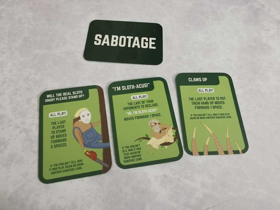 When you are eliminated from the game on your turn, you do not use the spinner, instead, you can draw a sabotage card or use your character card Sabotage power to really change up the game. Play continues until there is just one Sloth remaining on the track.