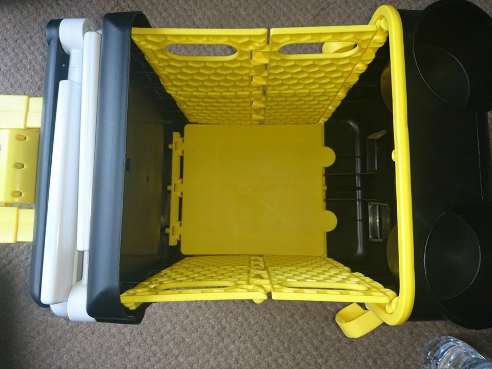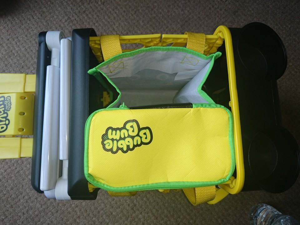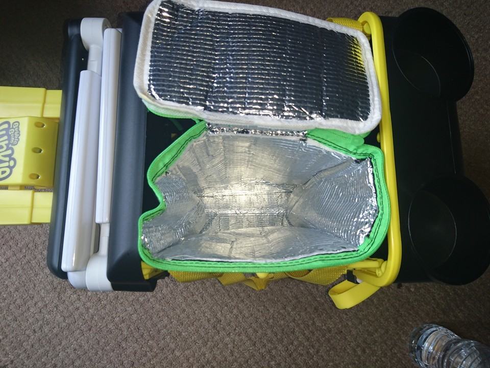 The Junkie comes folded up and unfolds by releasing the clips on the side. You then open up the side compartments and lower the yellow bottom that holds the Junkie open. You then insert the bag which fits nicely and has two different types of pockets. It includes an insulated zip closed area and an open area for placing rubbish or other objects.